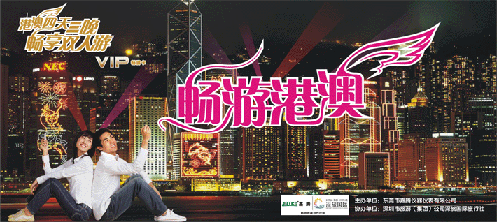 為答謝您一直以來對我嘉騰公司的關(guān)懷與厚愛,東莞市嘉騰儀器儀表有限公司與深圳市旅游(集團(tuán))公司深旅國際旅行社攜手推出“購嘉騰儀器,港澳雙人游”活動(dòng):自2010年10月1日起(有效期限2011年12月31日止),凡購買嘉騰公司指定產(chǎn)品(高端儀器或大型儀器)一臺以上,均可獲得我公司饋贈(zèng)的“港澳四天三晚雙人游--VIP暢游卡”一份!多買多送,送完即止!