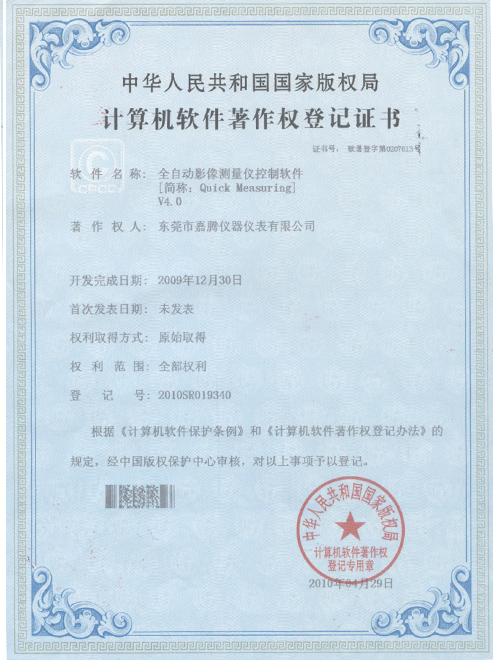 Quick Measuring V4.0測(cè)量?jī)x控制軟件獲得著作權(quán)證書(shū)