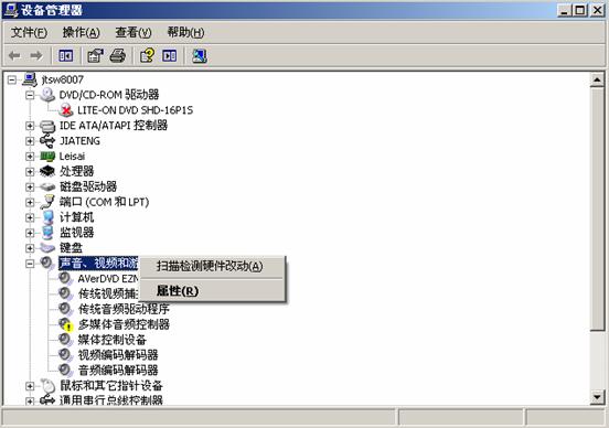 第三步:在“設(shè)備管理器”窗口中的“聲音、視頻和游戲控制器”上右擊,在彈出的菜單上選擇“掃描檢測(cè)硬件改動(dòng)”項(xiàng)。(若沒(méi)有檢測(cè)到視頻卡硬件,請(qǐng)確認(rèn)視頻卡是否好的或者是否插好。)在掃描到的視頻卡設(shè)備的名字上右擊,在彈出的菜單中選擇“更新驅(qū)動(dòng)程序”項(xiàng)。