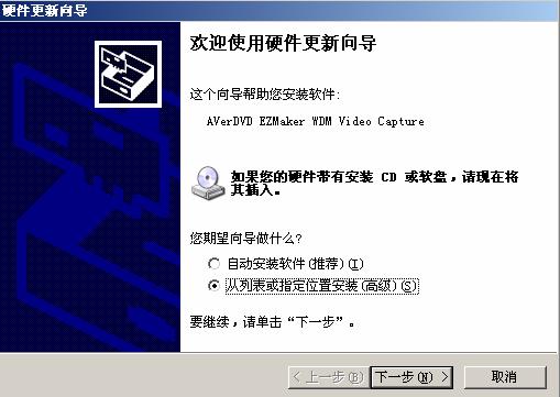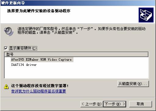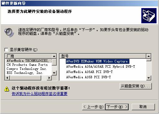 在彈出的“硬件更新向?qū)?/b>”的窗口中在“廠商”欄中點(diǎn)擊“AverMedia TECHNOLOGIES,Inc”項(xiàng),然后在“型號(hào)”欄中選中“AVerDVD EZNMaker WDM Video Capture”,然后點(diǎn)“下一步”?;蛘吖瓷?ldquo;顯示兼容硬件”項(xiàng),在型號(hào)欄中選中“AVerDVD EZNMaker WDM Video Capture”。