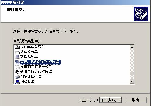 在彈出的“硬件更新向?qū)?/b>”窗口中選“聲音、視頻和游戲控制器”并點(diǎn)“下一步”。