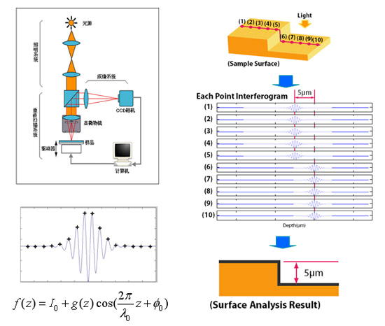 白光干涉三維形貌儀是利用光學干涉原理研制開發(fā)的超精密表面輪廓測量儀器。照明光束經(jīng)半反半透分光鏡分成兩束光,分別投射到樣品表面和參考鏡表面。從兩個表面反射的兩束光再次通過分光鏡后合成一束光,并由成像系統(tǒng)在CCD相機感光面形成兩個疊加的像。由于兩束光相互干涉,在CCD相機感光面會觀察到明暗相間的干涉條紋。干涉條紋的亮度取決于兩束光的光程差,根據(jù)白光干涉條紋明暗度以及干涉條文出現(xiàn)的位置解析出被測樣品的相對高度。